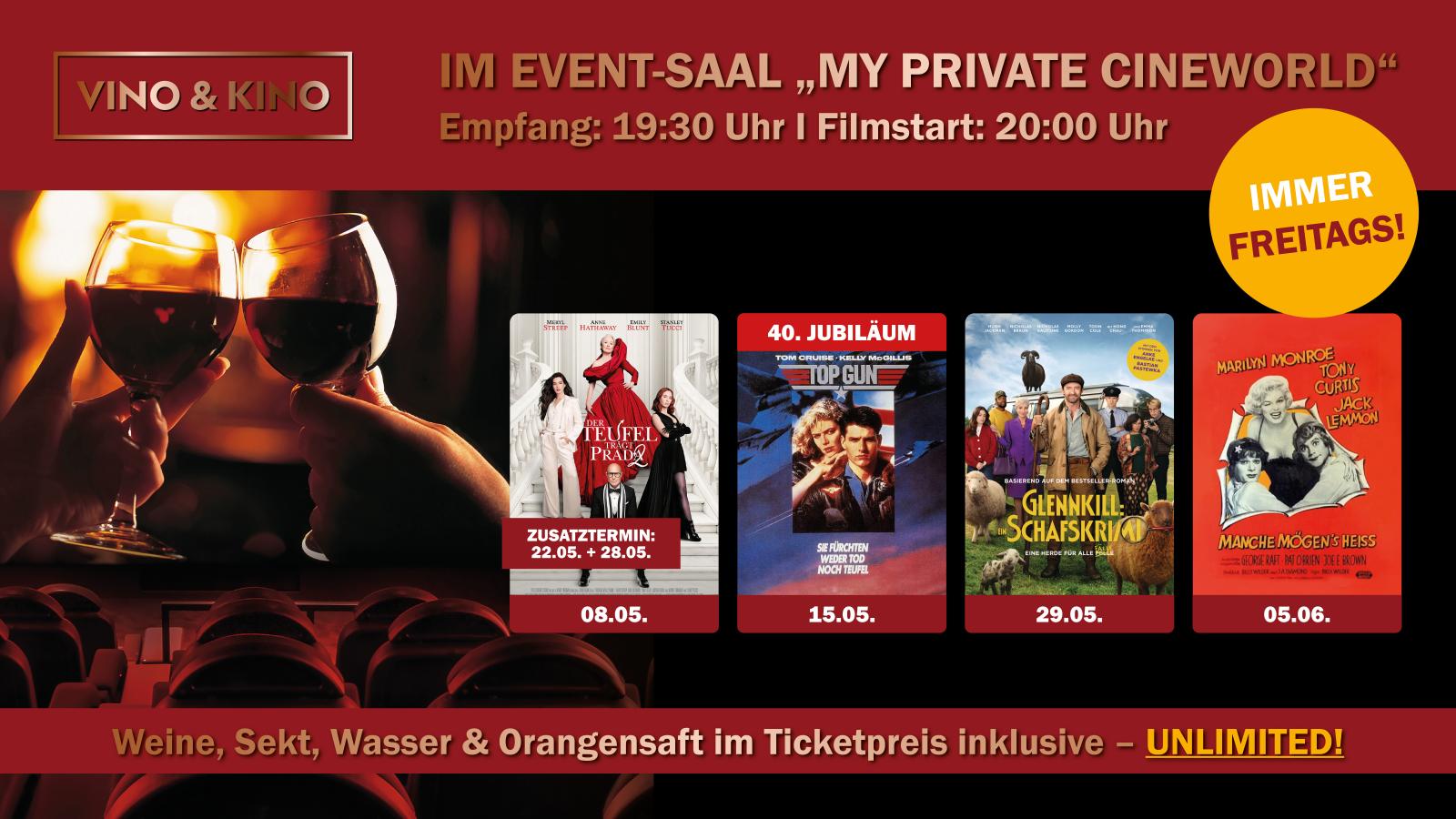 Bei unseren Vino & Kino Specials sind Wein, Sekt, Wasser und Saft während des Empfangs und der gesamten Vorstellung im Eintrittspreis inklusive!